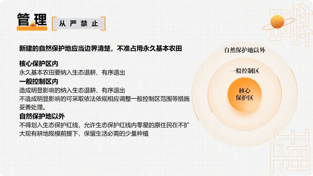 目前已划入自然保护地核心保护区内的永久基本农田要纳入生态退耕、有序退出。