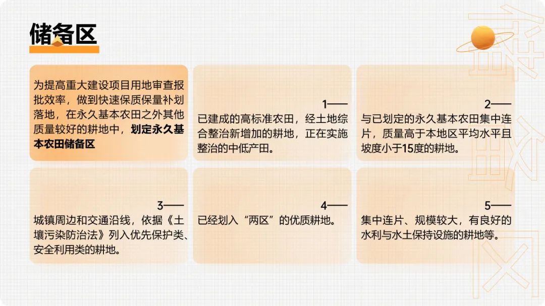 为提高重大建设项目用地审查报批效率,做到快速保质保量补划落地,在永久基本农田之外其他质量较好的耕地中,划定永久基本农田储备区。