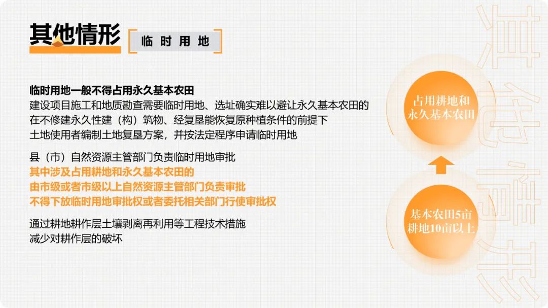 县(市)自然资源主管部门负责临时用地审批,其中涉及占用耕地和永久基本农田的,由市级或者市级以上自然资源主管部门负责审批,一般不超过两年。同时,通过耕地耕作层土壤剥离再利用等工程技术措施,减少对耕作层的破坏。