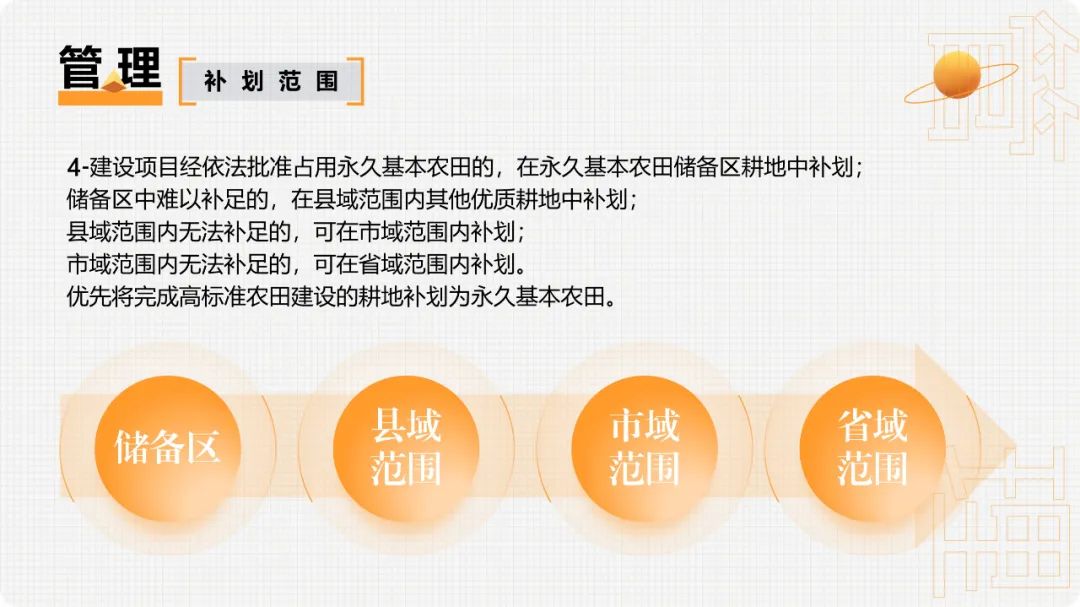 4.建设项目经依法批准占用永久基本农田的,在永久基本农田储备区耕地中补划;储备区中难以补足的,在县域范围内其他优质耕地中补划;县域范围内无法补足的,可在市域范围内补划;市域范围内无法补足的,可在省域范围内补划。优先将完成高标准农田建设的耕地补划为永久基本农田。