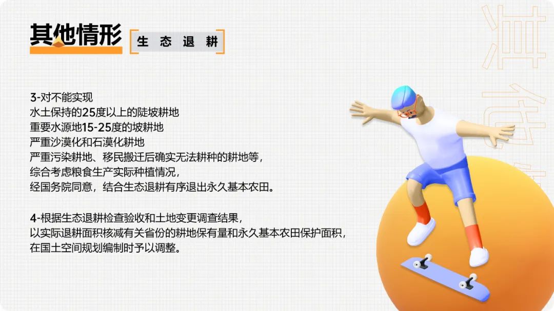 3.对不能实现水土保持的25度以上的陡坡耕地、重要水源地15-25度的坡耕地、严重沙漠化和石漠化耕地、严重污染耕地、移民搬迁后确实无法耕种的耕地等,综合考虑粮食生产实际种植情况,经国务院同意,结合生态退耕有序退出永久基本农田。