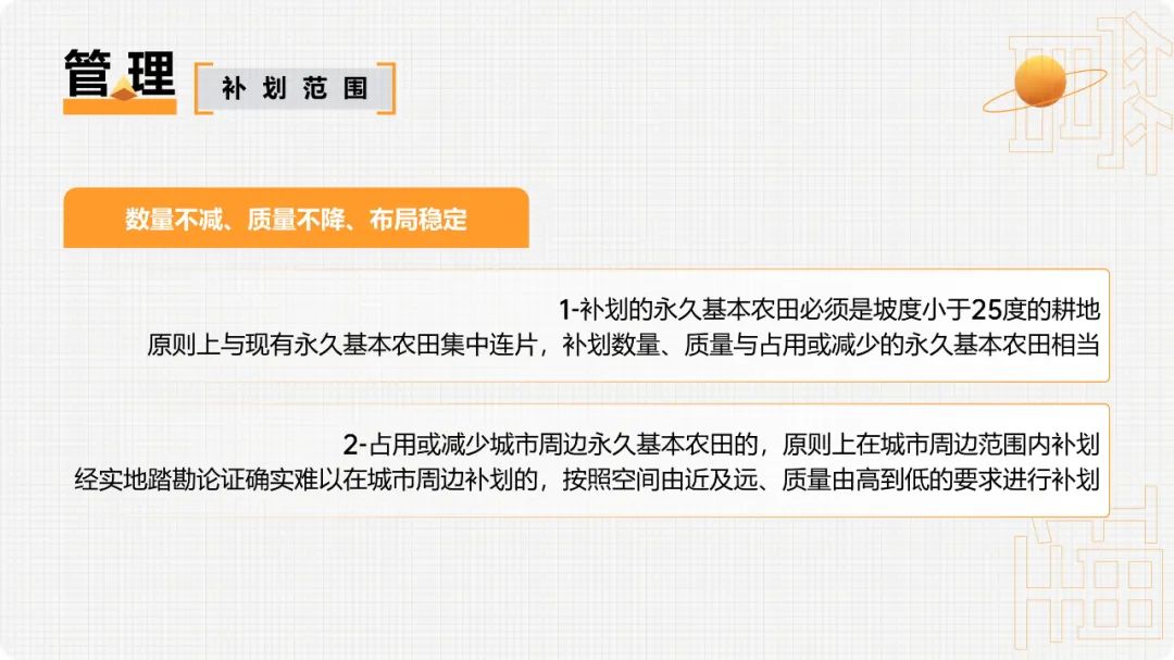 1.补划的永久基本农田必须是坡度小于25度的耕地,原则上与现有永久基本农田集中连片,补划数量、质量与占用或减少的永久基本农田相当。
