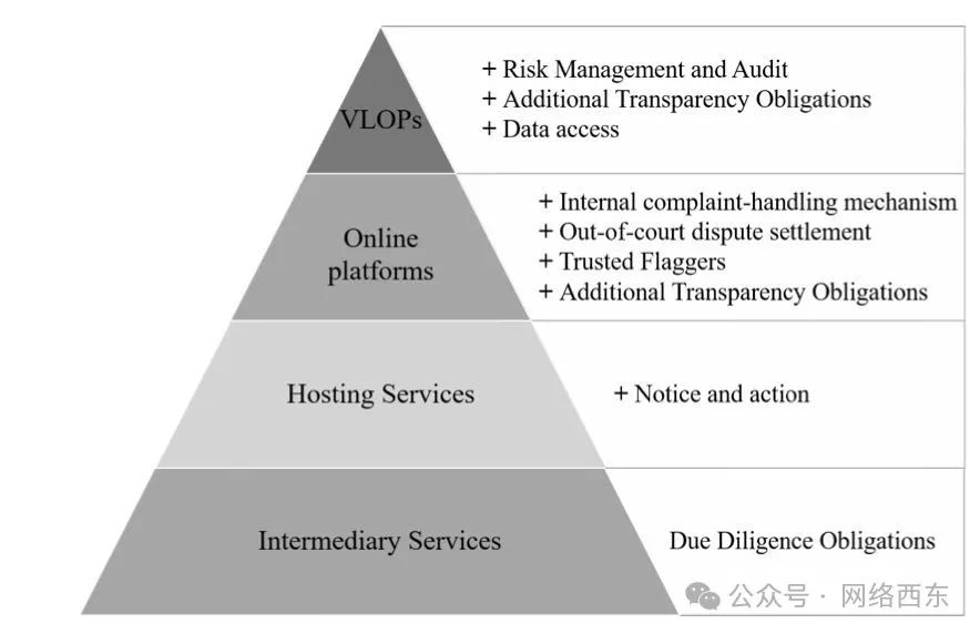 本次欧盟《数字服务法》所创造的制度亮点之一是赋予了中介服务提供商的透明度和尽职调查义务义务,后者包括“纯粹的渠道”、“缓存”和“托管”的服务,这改变了自2000年《电子商务指令》施行以来一直保持稳定的欧盟中介服务提供商的义务范围。更显著的制度亮点是《数字服务法》细化了对中介服务类别内的区别。除了适用于所有中介服务提供商的规定之外,《数字服务法》还增加托管服务提供商和在线平台的义务。《数字服务法》实行金字塔结构,一般“尽职调查义务”适用于广泛的中介服务提供商群体,额外的义务只影响一些中介服务类型日益有限的某些提供者。拟议的义务累积适用,这意味着在线平台也需要遵守一般中介服务和托管服务提供者的尽职调查义务。因此,VLOP不仅必须遵守与其类别具体相关的义务,还必须遵守“普通”在线平台的义务。然而,《数字服务法》对不同中介服务的分类仍然可能导致不确定性。例如,云基础设施似乎属于在线平台类别,即在线平台类别(或可能是VLOP),尽管它们在技术上无法监控或管理它们代表客户存储的内容。