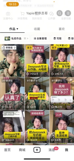 除了发布在网易云音乐外,Yapie还制作了如何使用AI制作歌曲的教程,并发布在了抖音、微博等平台,他的视频也登上了热搜。目前在Yapie抖音账号置顶的《成为歌手保姆级教程,DeepSeek写词,AI作曲AI歌唱》的视频播放量已超过700万,点赞量超过11万,收藏量超8万,转发2.8万,评论超过3500条。