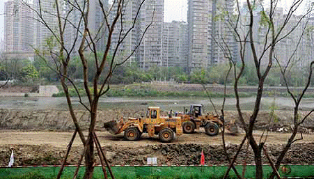 4月2日,位于四川省成都市高新区的锦江河道在进行整治。该段河道将通过清淤、截污、修路、造景等工程,打造成融生态休闲服务于一体的现代都市滨河景观带。图/视觉中国