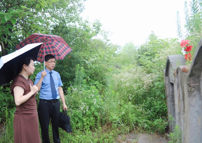 2024年6月,湖北省红安县检察院检察官邀请全国人大代表程星(左一)共同查看林清芝烈士墓破损情况。