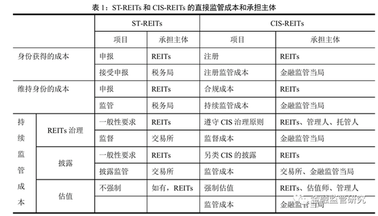 直接成本包括两个环节(见表1)。一是取得REITs身份的成本。二是持续运作的监管。相对而言,欧盟模式的监管成本更高。一是监管对象多;二是监管环节和项目多且频率高。