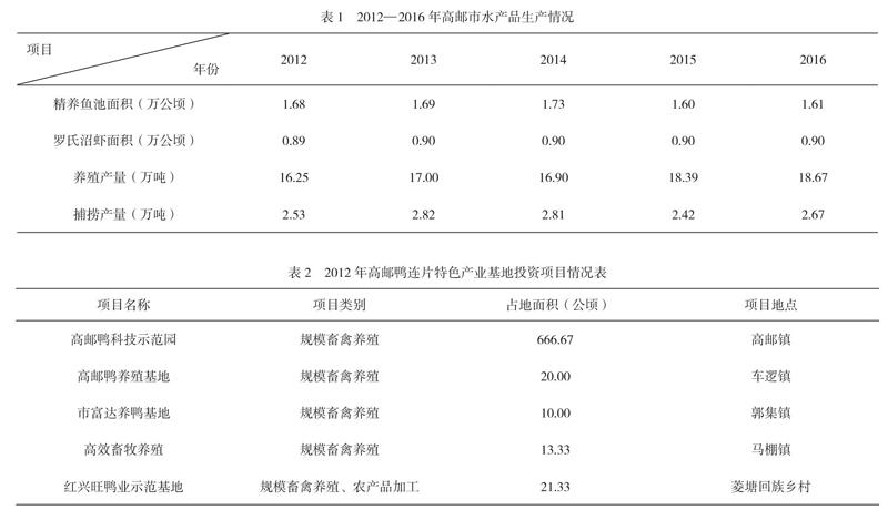 近年来高邮市水产品的生产情况由表1可知,鱼虾的养殖面积虽有起伏,但总体上还是呈扩增趋势,且其养殖产量一直不断增加;其次,由表2可见,高邮鸭在2012年成为最大的投资项目,大规模的畜禽养殖成为了当地的特色产业。综上可得,在如今的高邮湖泊湿地农业系统中,它的传统生产方式面临流失的危险。