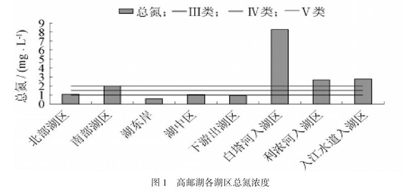 各湖区总氮浓度如图1所示,由图1可见,除高邮湖东岸和下游出湖区域外,其他湖区总氮浓度均超过Ⅲ类标准。北部湖区和湖中区总氮浓度分别超标0.1倍和0.02 倍,为Ⅳ类水质;南部湖区总氮污染严重,总氮浓度超标1.03倍,为劣Ⅴ类水质;总氮污染最严重的区域是靠近几条入湖河流的入湖口处,白塔河、利农河和入江水道入湖区域总氮浓度分别超标7.26倍、1.68倍和 1.78 倍,均为劣Ⅴ类水质。