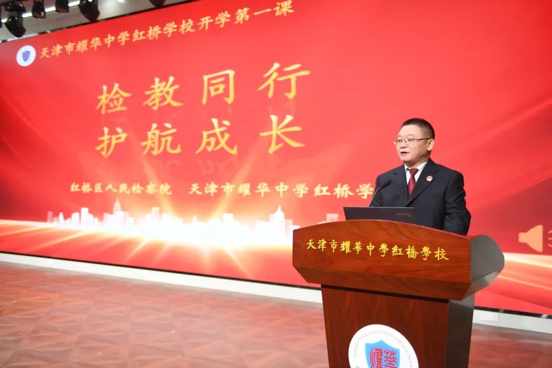 为进一步助力学校打造平安法治校园,提升未成年人法律素养和法治意识,开学首日,红桥区检察院干警走进天津市耀华中学红桥学校为全校师生讲授法治“开学第一课”,为同学们送上新学期“开学礼”。红桥区检察院党组成员、副检察长周铁震,耀华中学红桥学校党总支书记汪新华、党总支副书记、校长刘学宇及全校师生参加活动。