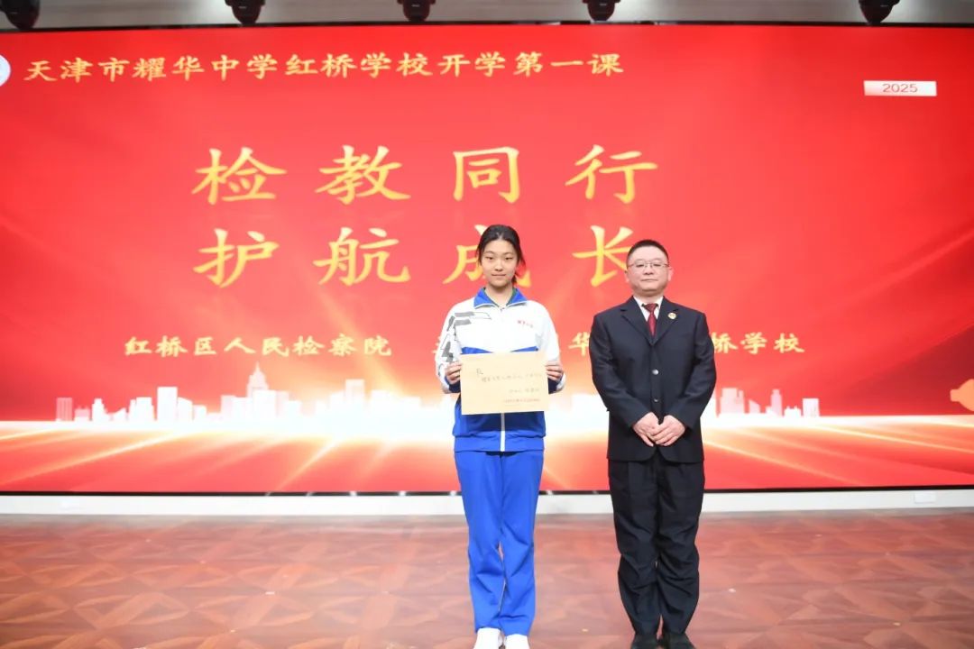 “作为法治副校长,殷切地希望你们在学习和生活中坚持以法为基,扣好法治的“第一粒扣子”,从内心深处敬畏法律、相信法律,自觉做到办事依法、遇事找法、解决问题用法,用好法律武器维护自身合法权益。”开学前夕,红桥区检察院党组书记、检察长、耀华中学红桥学校法治副校长陈建强,以“以法为镜立身正气 以梦为马不负韶华”为题,为全校师生送上新学期法治寄语,引导同学们学法明理,真正成为有底线、有原则、有使命、有梦想的新时代青年。活动中,周铁震副检察长郑重宣读了陈建强检察长送给同学们的新年信笺,字字箴言承载着检察机关对青少年的殷切关怀。