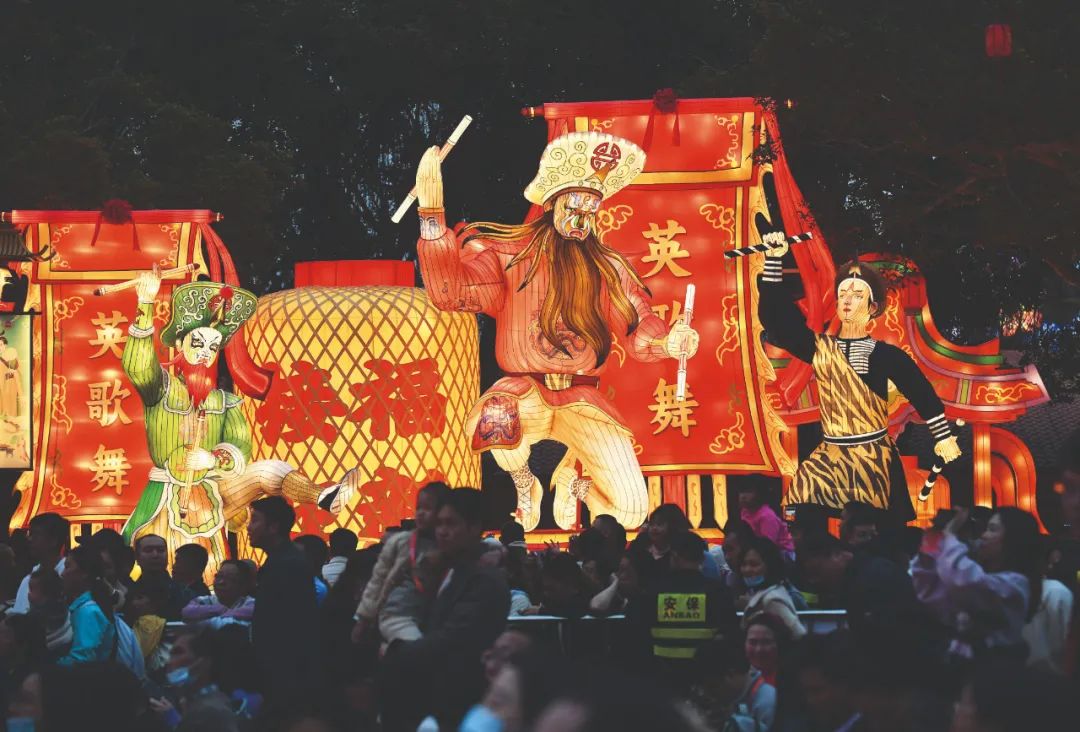>>1月22日晚,观众在粤港澳大湾区灯会上欣赏英歌舞主题花灯。新华社发 许建梅/摄