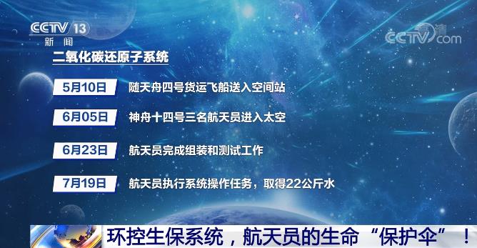中国空间站环控生保系统主任设计师 李森:在此之前,我们的环境控制与生命保障系统已经通过5个再生子系统,也就是电解制氧子系统、二氧化碳去除子系统、微量有害气体去除子系统、尿处理子系统、水处理子系统的运行,实现了大气和水的再生,水资源的物质闭合度已经超过了80%,而这次经过二氧化碳还原子系统的稳定运行,我们每天可以多回收一公斤左右的水,使水资源的物质闭合度提高到了90%以上。