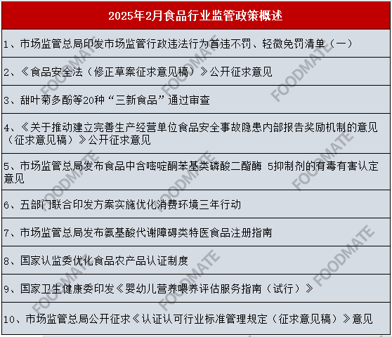 食品伙伴网讯 2025年2月,国家市场监管总局、国家卫生健康委员会、国家认监委等部门发布了一系列食品行业监管政策,食品伙伴网整理汇总如下: