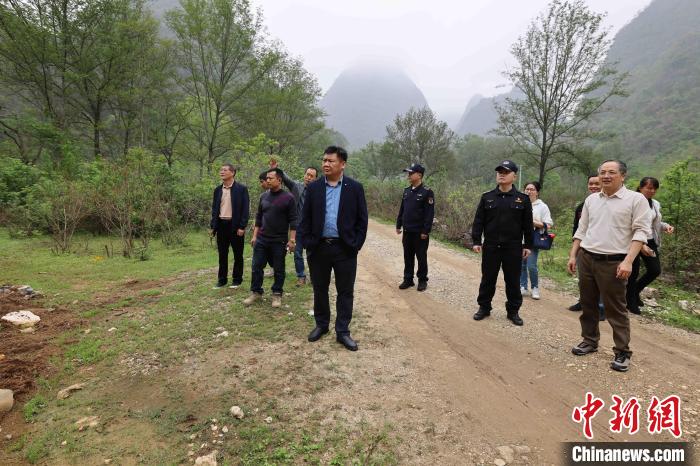 2021年3月,汤建伟(右三)实地调研桂林漓江风景名胜区喀斯特生态修复项目进展。(桂林漓江风景名胜区管理委员会供图)
