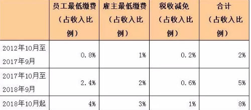 为了提高人们的养老金积累程度,促使人们更简便地开始积累养老金,英国自2012年10月即已开始实行“自动加入”职业养老金。目前,22岁以上、年收入超过9440英镑的劳动者自动被雇主纳入职业养老金计划。员工缴费及雇主匹配缴费的下限要求及其过渡执行的时间表如下: