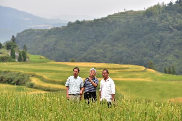 中科院地理资源所研究员、农业部全球重要农业文化遗产专家委员会副主任委员兼秘书长闵庆文(中)和青田农业文化遗址保护办公室主任吴敏芳(左)和当地农民交流稻鱼共生农业文化遗产保护情况(9月18日摄)。