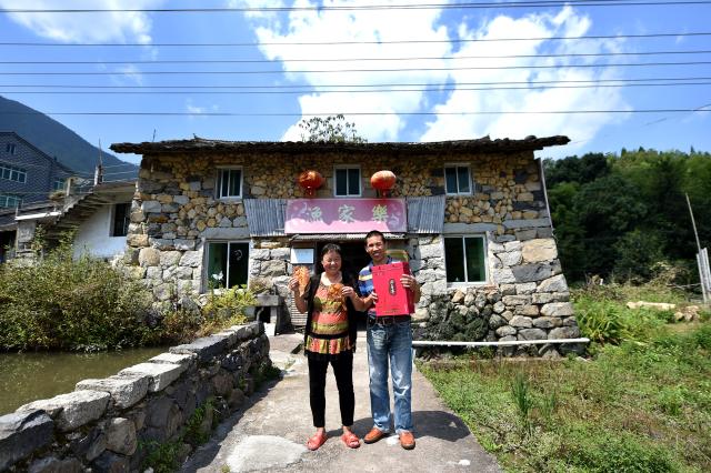 青田县方山乡龙现村农民杨民康(右)、伍丽贞夫妇在自家农家乐饭馆前展示自家做的田鱼干(9月18日摄)。