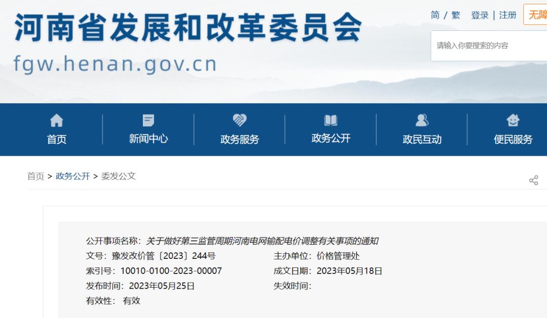 近日,河南省发展和改革委员会印发《关于做好第三监管周期河南省级电网输配电价调整有关事项的通知》(以下简称《通知》),自2023年6月1日起,执行国家发展改革委核定的第三监管周期河南电网输配电价。居民生活和农业生产用电价格不变,仍按现行标准执行。