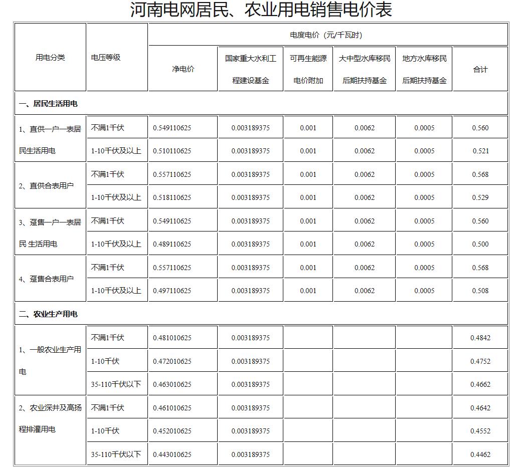 2.河南电网居民、农业用电销售电价表