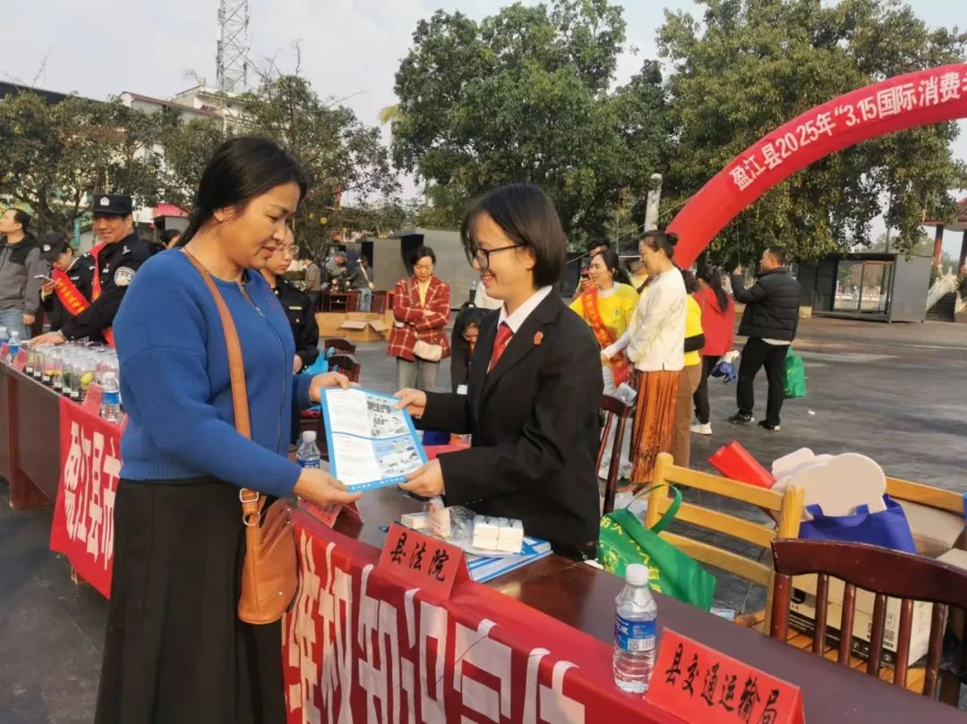 为切实增强广大群众的消费维权意识,提升消费者风险防范能力,营造更加安全放心的消费环境,同时引导群众将消费与环保相融合,2025年3月14日上午,在第43个国际消费者权益日来临之际,我院组织干警参加由盈江县市场监督管理局、县消费者协会主办,以“共筑满意消费”为主题的“3.15”国际消费者权益日宣传活动。
