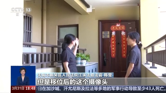 无锡市新吴区人民法院江溪法庭法官 陈莹:原先的摄像头,是安装在入户门的正上方,就是我们现在看到目前还有三个孔的地方。摄像头可以360°旋转,这个方位是原告家的卧室,摄像头必然能够拍摄到原告家卧室的情况。同时这个方位是原告家厨房,摄像头安装之后,肯定能够拍到原告家中厨房的相关活动信息。后来被告就将原先正上方的摄像头,移位到了我们现在看到的右手边悬梁处,安装在了这个地方,但是移位后的摄像头依然可以360°旋转,还是同样可以拍摄到原告家卧室的情况。