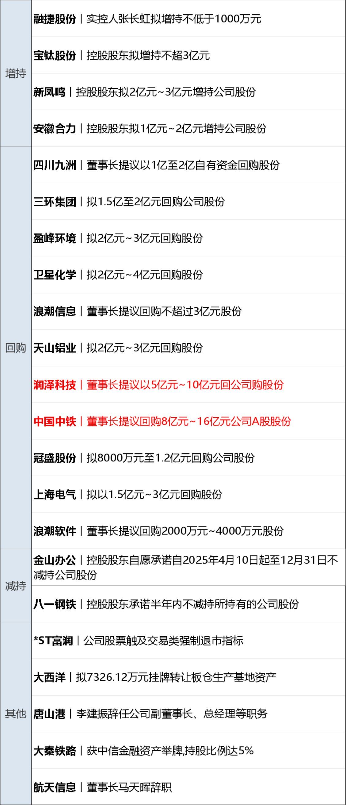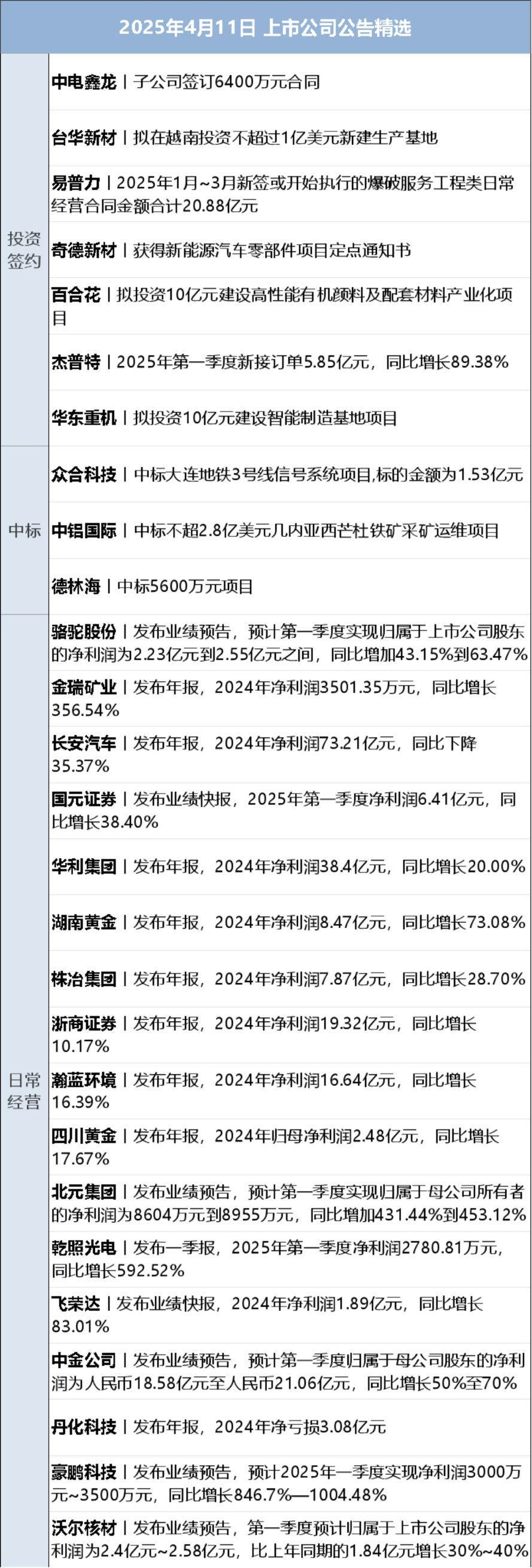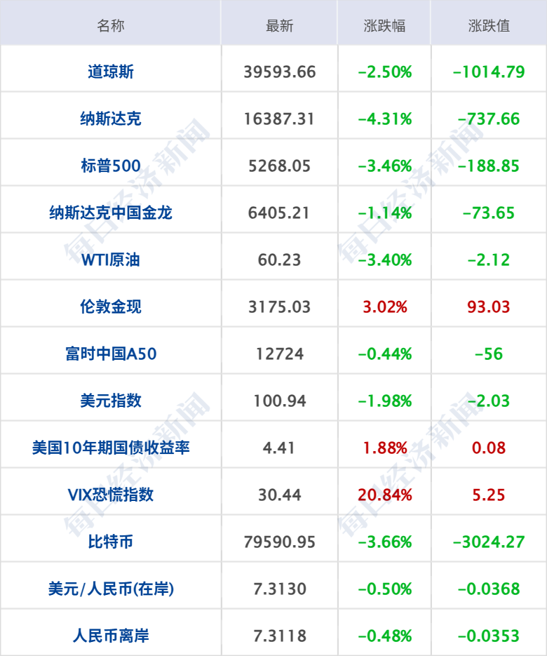 1 隔夜市场 美股三大指数集体收跌,纳指跌4.31%,标普500指数跌3.46%,道指跌1014.79点,跌幅2.5%;大型科技股集体下挫,特斯拉跌超7%,Meta跌超6%,英伟达、亚马逊跌超5%,苹果跌超4%,谷歌跌超3%,微软跌超2%。纳斯达克中国金龙指数跌1.14%,中概股多数走低,拼多多、富途控股跌超6%,老虎证券跌超4%,爱奇艺跌超3%,百度跌超2%,阿里巴巴跌0.57%,理想汽车涨超5%,小鹏汽车涨超3%。 美国3月CPI同比增长2.4%,预估为增长2.6%,前值为增长2.8%。美国3月CPI环比下降0.1%,预估为增长0.1%,前值为增长0.2%。 富时A50期指连续夜盘收跌0.44%,报12724点。 现货黄金涨3.02%,报3175.03美元/盎司,再创历史新高;COMEX黄金期货涨3.73%,报3194.2美元/盎司,创收盘历史新高;COMEX白银期货涨2.3%,报31.115美元/盎司。 国际油价大幅收跌,美油主力合约跌3.40%,报60.23美元/桶;布伦特原油主力合约跌2.93%,报63.56美元/桶。 欧洲三大股指收盘全线上涨,德国DAX指数涨4.53%报20562.73点,法国CAC40指数涨3.83%报7126.02点,英国富时100指数涨3.04%报7913.25点。 2 聚焦关税 国家电影局就电影方面应对美升级对华关税答记者问 4月10日,就近期有记者询问美国对华加征关税一事是否会影响到美国电影进口,国家电影局发言人表示,美国政府对中国滥施关税的错误行径,势必会令国内观众对美国影片好感度进一步降低。我们将遵循市场规律,尊重观众选择,适度减少美国影片进口数量。中国是全球第二大电影市场,我们始终坚持高水平对外开放,将引进世界更多国家优秀影片,满足市场需求。(央视新闻) 外交部:中方将继续采取坚决有力措施 外交部发言人林剑主持4月10日举行的例行记者会。在回答有关中方发布赴美风险提示的问题时,林剑表示,这是因为美方对华一味地进行极限施压的霸道霸凌行径,严重恶化中美关系的社会基础和民意环境,严重干扰两国各领域的交往与合作。中方将继续采取坚决有力措施,坚决维护自身的正当合法权益。(央视新闻) 中方是否会继续对美加征更高关税?商务部回应 4月10日15时,商务部召开例行新闻发布会。有记者提问:特朗普宣布将对不采取报复性行动的国家实施90天的关税暂停,但是上调对华关税至125%,甚至可能到150%,中国是否会继续对美加征更高关税?商务部新闻发言人表示,对于你提的假设性问题,目前我无法进行评论。但是我想强调的是,贸易战没有赢家,保护主义没有出路。如果美方一意孤行,中方将奉陪到底,我们绝不接受美方的极限施压和霸凌行径,必将采取坚决有力措施捍卫自身正当权益。(央视新闻) 国家外汇局官员:展望未来,我国经济基本面和外汇市场韧性较强 4月10日,中国外汇发表外汇管理局国际收支司司长贾宁署名文章称,展望未来,我国经济基本面和外汇市场韧性较强,外汇市场有条件保持基本平衡。一是我国将实施更加积极有为的宏观政策,未来经济回升向好将对人民币汇率稳定和外汇市场平稳运行形成重要支撑。二是经常账户有望保持合理顺差格局。我国制造业发展水平全球领先,制造业增加值在全球占比上升至30%,在全球生产供给中的作用不可替代。贸易方式和贸易伙伴更趋多元,跨境电商、市场采购、新能源产品等外贸新增长点快速发展,外贸韧性增强有助于更好应对外部冲击挑战。在全球贸易环境复杂情况下,近年来企业应对外部冲击的能力上升,自信心增强。三是资本项下跨境资金流动有望更加稳定。我国创新驱动发展战略加快推进,外资投资中国科技产业、增持中国资产的意愿增强。四是我国外汇市场韧性总体增强,抵御外部冲击能力提升。人民币汇率保持适当弹性,可以有序释放压力,促进市场自我平衡。汇率避险工具和人民币结算广泛运用,货物贸易项下人民币跨境收支占比提升至近30%,企业外汇套保比率上升至27%,均处于历史高位,有助于稳定市场预期和交易。 3 两部门:鼓励民营企业通过直接投资或者独资、控股、参股等方式积极参与收费公路新机制建设项目 交通运输部办公厅、国家发展改革委办公厅近日联合印发了《收费公路政府和社会资本合作新机制操作指南》。充分激发民营企业参与收费公路投资的积极性。通过完善准入制度,鼓励民营企业通过直接投资或者独资、控股、参股等方式积极参与收费公路新机制建设项目。在同等条件下,优先推荐独立投标的民营企业或有民营企业参与的联合体为中标候选人。 4 2025年全国出口管制工作会议在京召开 4月9~10日,2025年全国出口管制工作会议在北京召开。会议指出,党中央、国务院高度重视出口管制工作,党的二十届三中全会对完善出口管制体系作出重要部署。当前国际形势复杂严峻,商务部深入贯彻落实党中央、国务院决策部署,会同各有关部门、各地方加快完善现代化国家出口管制体系,持续提升出口管制效能,统筹好发展和安全,以高水平安全保障高质量发展。 会议要求,全面贯彻党的二十届三中全会精神,从完善法律法规、加强物项列管、强化许可执法、加强多双边出口管制对话交流、推进合规建设等方面,进一步完善现代化国家出口管制体系,更好维护国家主权、安全、发展利益,为建设社会主义现代化国家、全面推进中华民族伟大复兴作出积极贡献。(商务部网站) 5 深夜大涨!人民币好消息 周四(4月10日)纽约尾盘,离岸人民币兑美元涨353个基点,报7.3118,较周二创下的年内低点回升逾千点。一位香港某银行外汇交易员