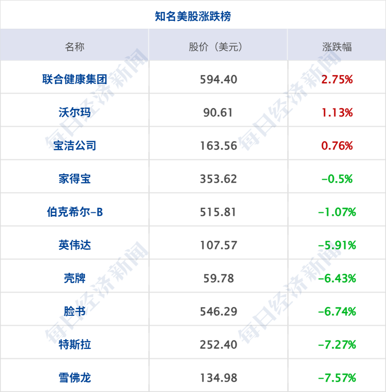 美股三大指数集体收跌,纳指跌4.31%,标普500指数跌3.46%,道指跌1014.79点,跌幅2.5%;大型科技股集体下挫,特斯拉跌超7%,Meta跌超6%,英伟达、亚马逊跌超5%,苹果跌超4%,谷歌跌超3%,微软跌超2%。纳斯达克中国金龙指数跌1.14%,中概股多数走低,拼多多、富途控股跌超6%,老虎证券跌超4%,爱奇艺跌超3%,百度跌超2%,阿里巴巴跌0.57%,理想汽车涨超5%,小鹏汽车涨超3%。