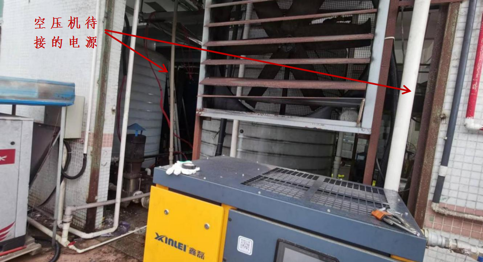 5.事发周边情况经现场勘查,铁质平台上方无重物,可以排除物体打击情况;3#调合罐南侧厂房外有一台空压机,现场空压机电源线已放置车间西侧墙壁上方的电缆线槽上,部分电源线已布置到西南转角处线槽架上,电源线未通电(见图6)。