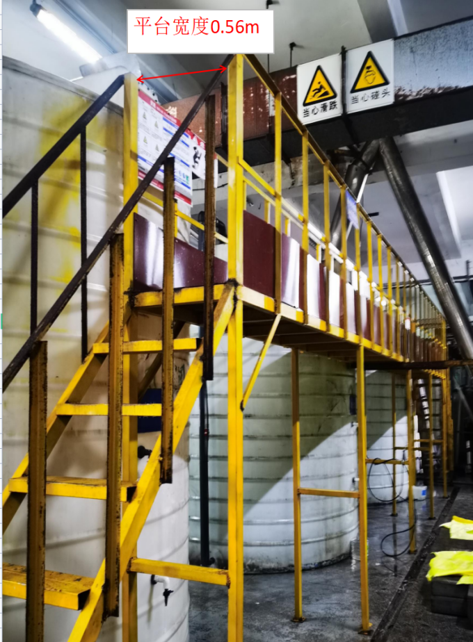 4.事故平台情况尿素混合系统区域铁质操作平台,平台高2.06m,平台上两侧设置有高0.94m的护栏,护栏内净宽度0.56m。操作平台在东西两侧各设置一个楼梯(见图5)。