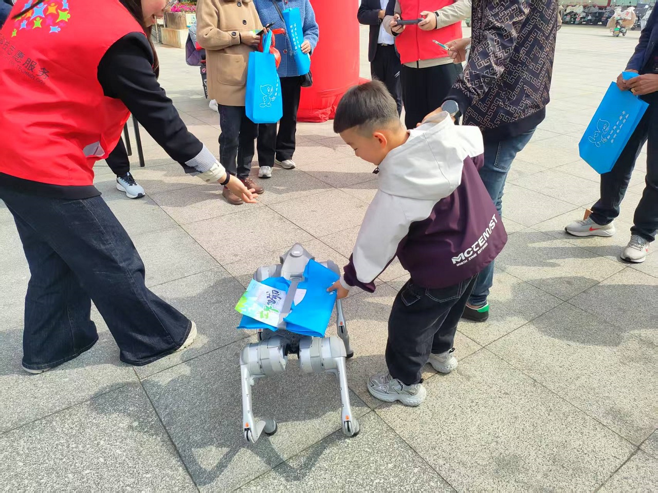 科技赋能“新玩法”,机器狗化身“普法小卫士”。活动现场,憨态可掬的智能机器狗成为“网红担当”。它身披“守护自然资源、建设法治政府”宣传贴纸,搭载语音播报系统,穿梭于人群中循环播放“节约资源、保护环境”“办事依法、遇事找法”等宣传口号,并向市民递送印有地球日标志和法治标语的环保宣传袋。机器狗还具备互动功能,通过人脸识别主动向儿童、老年人等群体“打招呼”,以趣味化方式传递生态保护与法治理念,吸引众多市民拍照打卡、参与互动,让严肃的法治宣传变得“接地气”“有人气”。