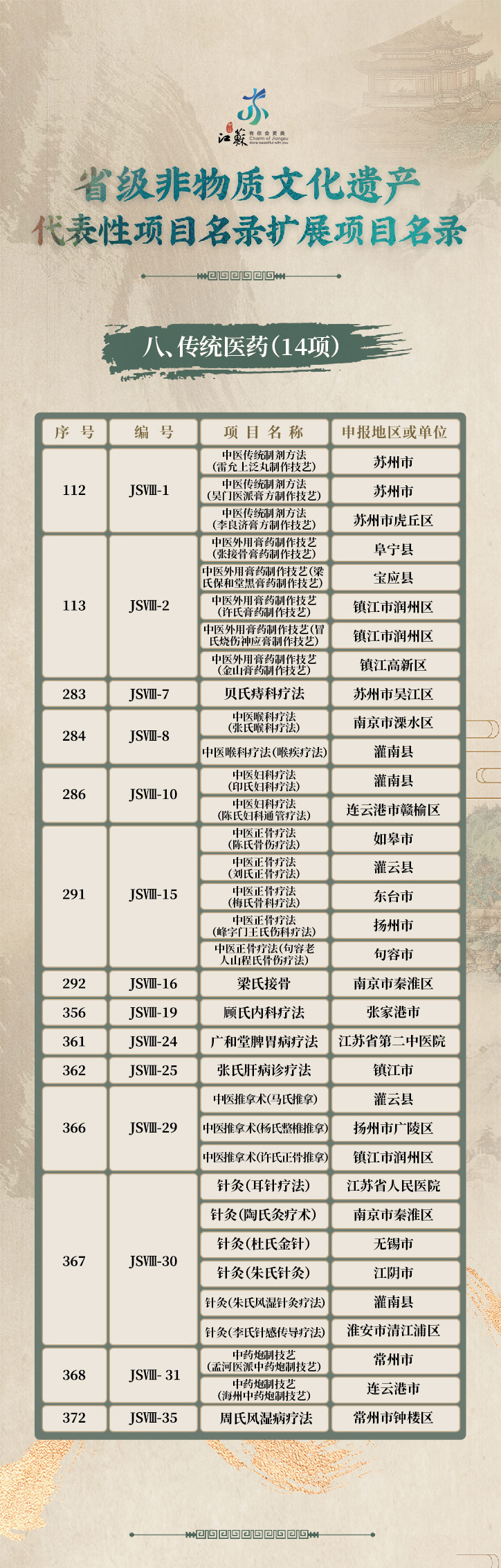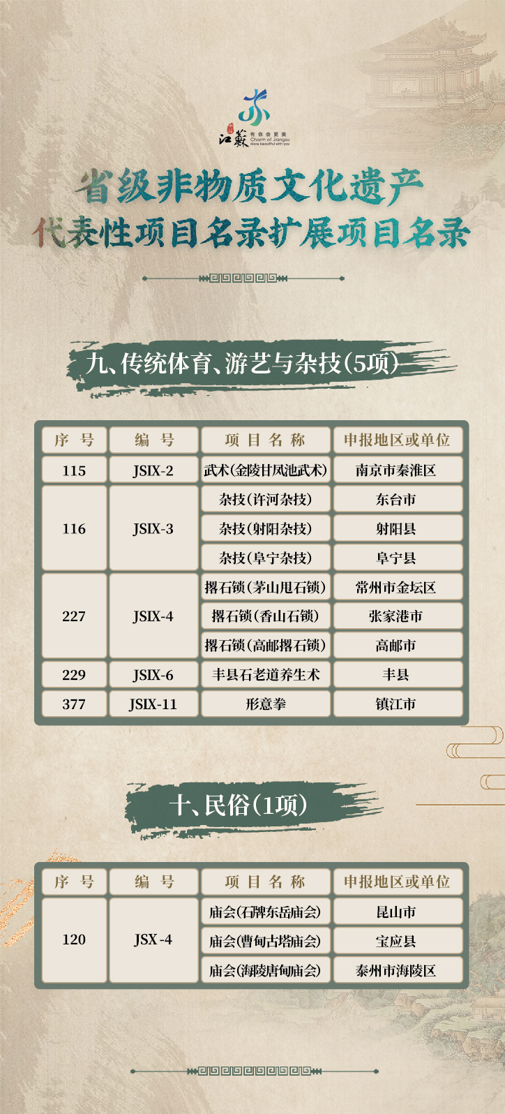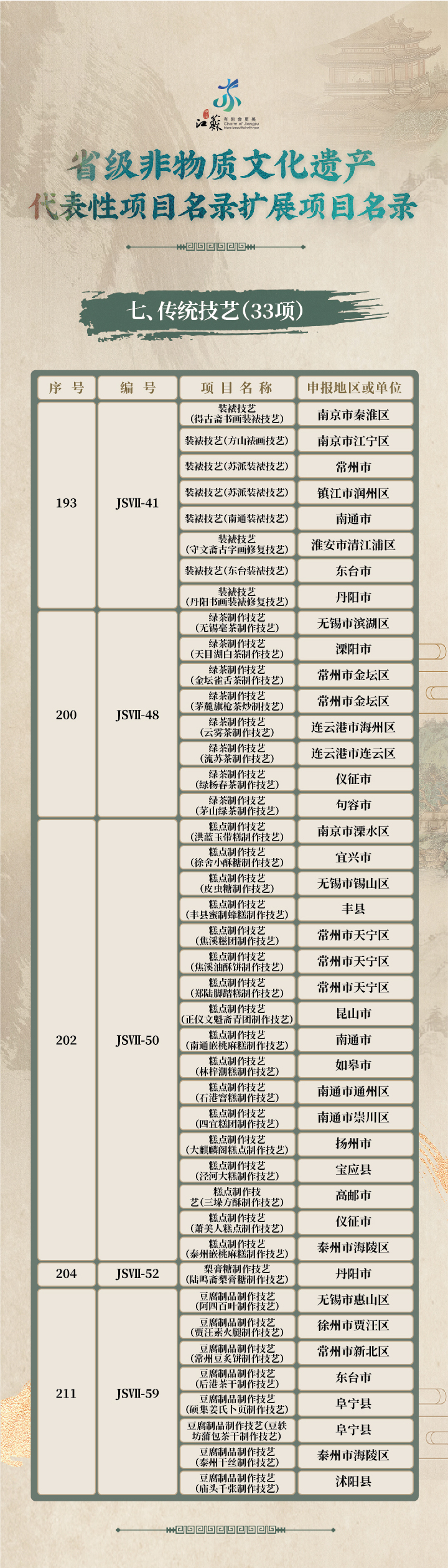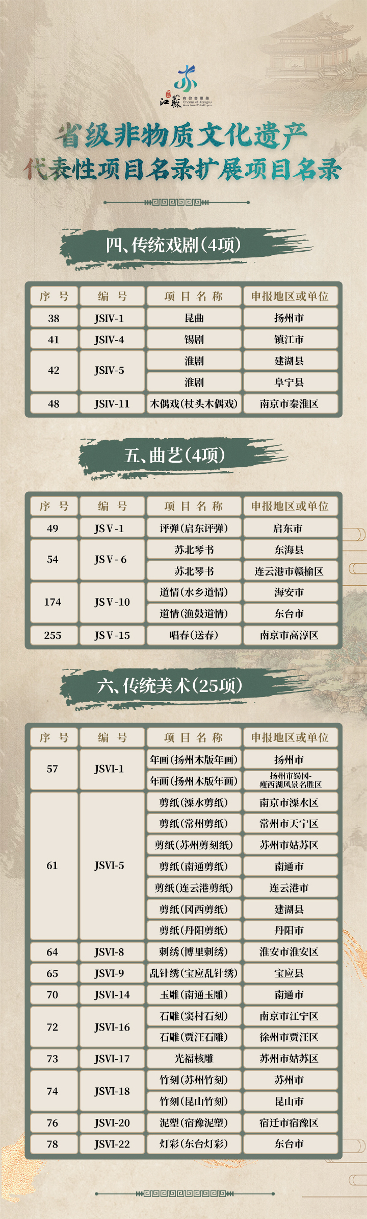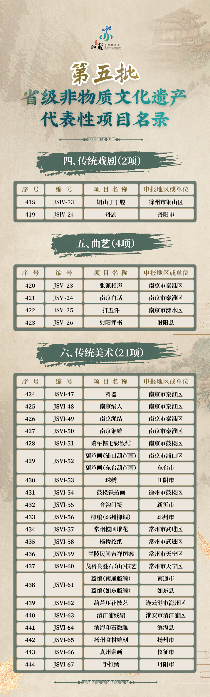 近日,省政府正式印发《关于公布第五批省级非物质文化遗产代表性项目名录的通知》(苏政发〔2023〕100号),共有421个项目入选第五批省级非物质文化遗产代表性项目名录,分别为新增项目145项(164个项目),扩展项目99项(257个项目)。截至目前,江苏共有1166个省级非物质文化遗产代表性项目。