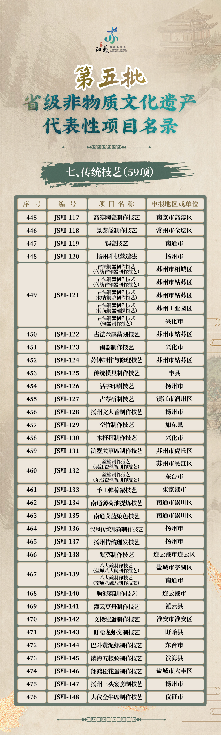 省文旅厅以《中华人民共和国非物质文化遗产法》《江苏省非物质文化遗产保护条例》《江苏省非物质文化遗产代表作申报评定暂行办法》有关规定为依据,坚持公平、公正、公开原则,确保评审工作的质量和水平,真正将地域特色鲜明、具有广泛影响力的项目推荐出来。经基层推荐、材料审核、专家评审、相关会议审议和社会公示等程序后,确定推荐入选第五批省级非遗代表性项目名录。