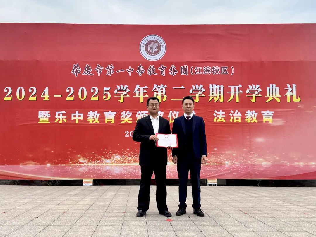 肇庆市第一中学教育集团党委书记马乃棉为肇庆中院党组副书记、副院长罗文军颁发法治副校长聘书