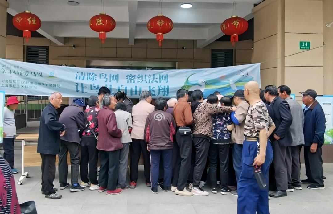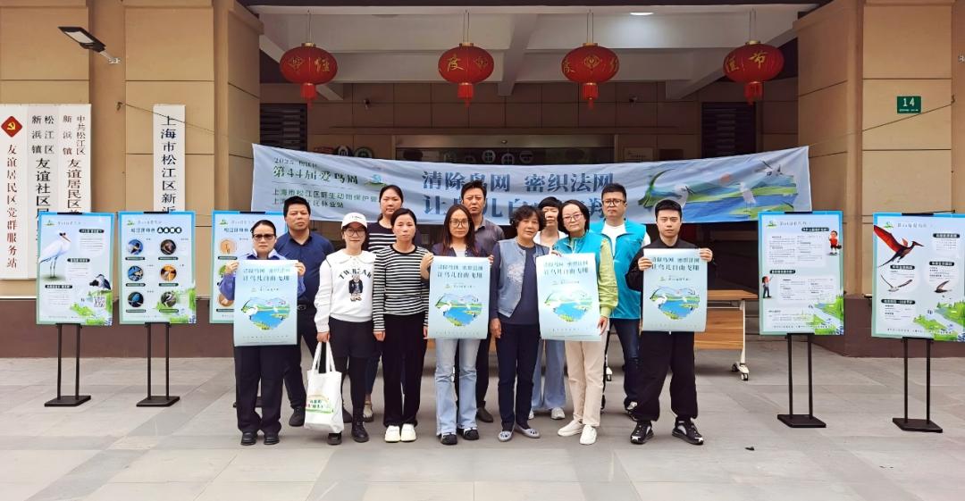 在新浜镇友谊居委会广场上,“清除鸟网 密织法网 让鸟儿自由飞翔”蓝色字幕格外醒目,各类图文并茂的鸟类等野生动物科普展板整齐排列,宣传普及鸟类知识,增强保护鸟类的意识。