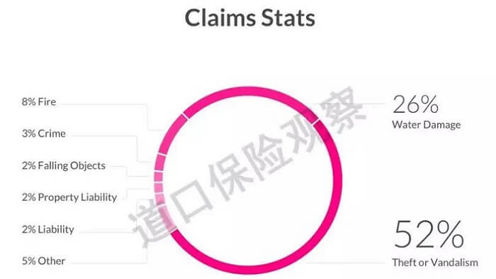 根据Lemonade公开的数据,52%的理赔为个人物品的盗抢理赔,26%为水灾理赔,其他的理赔内容包括火灾、犯罪等。