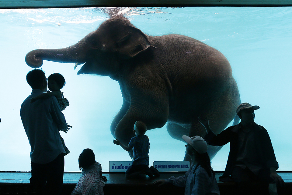 当地时间2020年2月4日,泰国春武里,游客参观动物园时观看一头大象在游泳池里游泳。 (视觉中国/图)