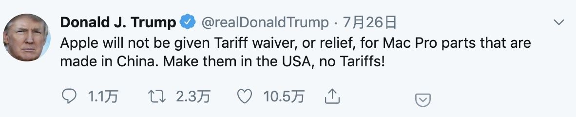 7 月 26 日,特朗普总统在 Twitter 上表示苹果不会对在中国生产的 Mac Pro 零件给予关税减免。据路透社报道,特朗普表示,他预计苹果将宣布将在德克萨斯州开设一家制造工厂。