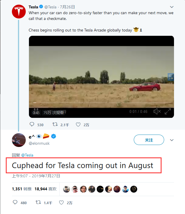 在 7 月 26 日宣布国际象棋登陆 Tesla Arcade 之后,伊隆·马斯克在后续推文中宣布《茶杯头》将于下月加入到特斯拉的信息娱乐系统中。