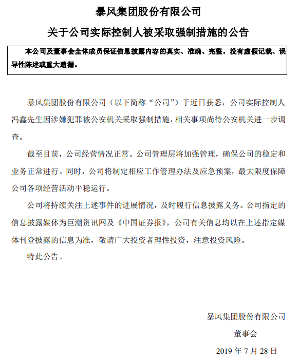 7 月 28 日晚间,暴风集团发布公告,公司于近日获悉,公司实际控制人冯鑫因涉嫌犯罪被公安机关采取强制措施,相关事项尚待公安机关进一步调查。截至目前,公司经营情况正常。公司管理层将加强管理,确保公司的稳定和业务正常进行。