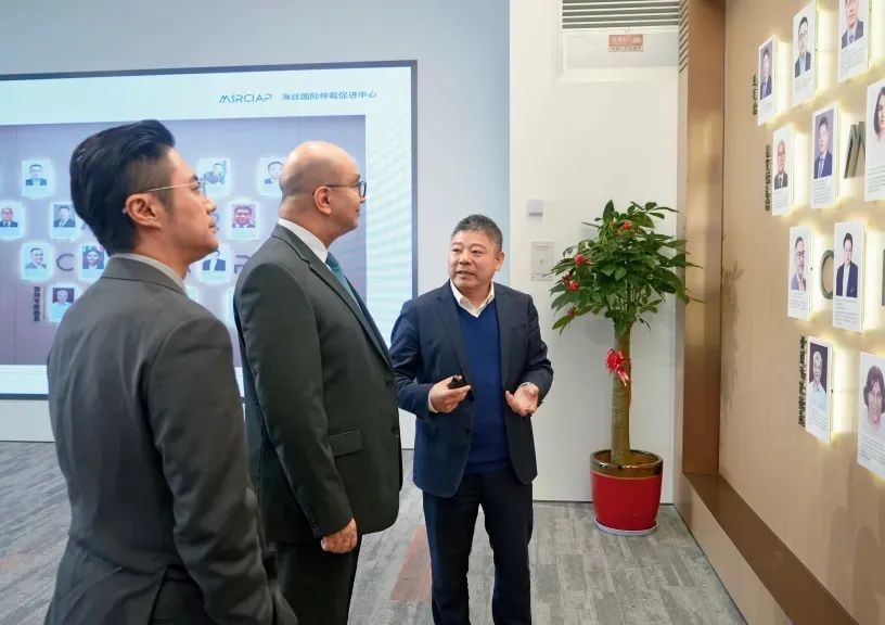 ↑2025年4月1日,国际法律专家在海丝国际仲裁促进中心参访,厦门市法学会法学咨询专家安寿志介绍情况。