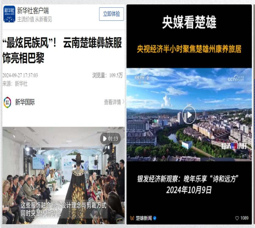 2024年9月27日,新华社报道彝绣参展巴黎时装周;2024年10月9日,央视《经济半小时》聚焦楚雄州康养旅居