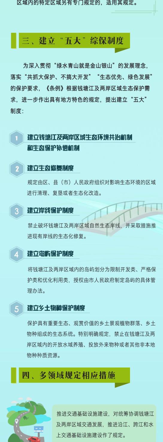 为深入贯彻“绿水青山就是金山银山”的发展理念,落实“共抓大保护、不搞大开发”“生态优先、绿色发展”的保护要求,《条例》根据钱塘江及两岸区域生态保护需求,进一步作出具有地方特色的规定,提出建立“五大”制度——