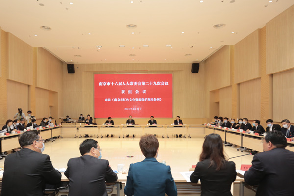 2021年4月21日,南京市十六届人大常委会第二十九次会议在雨花台烈士纪念馆召开联组会议,审议《南京市红色文化资源保护利用条例》。摄影/肖日东
