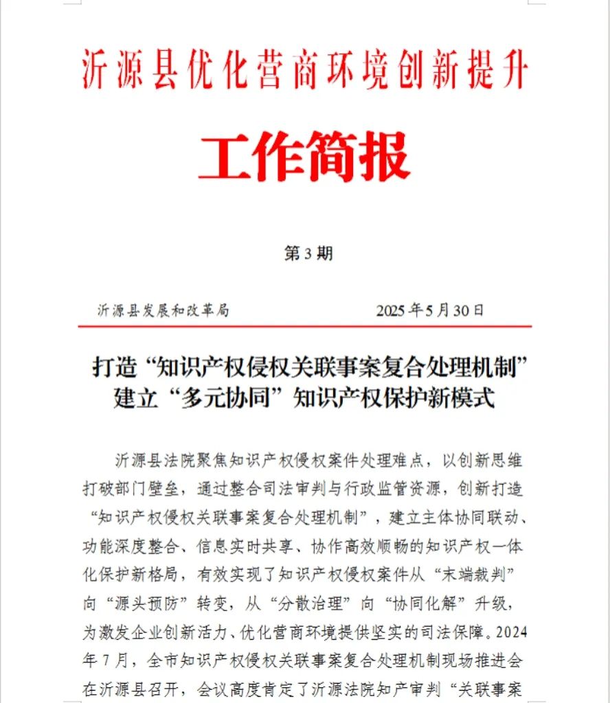 原标题:《县优化营商环境工作简报第3期刊发我院《打造“知识产权侵权关联事案复合处理机制” 建立“多元协同”知识产权保护新模式》》