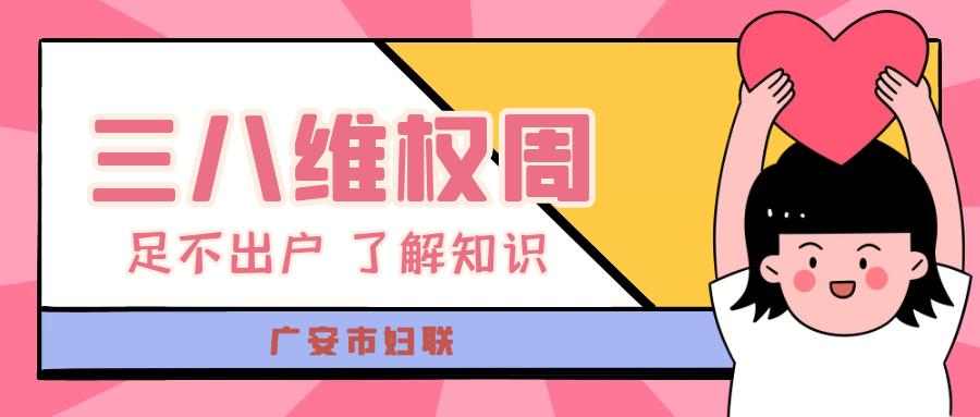 春暖花开的三月,为进一步加强妇女法治宣传,引领广大妇女群众尊法、学法、守法、用法,不断深化平安家庭、文明家庭建设,强化妇女维权意识和维权能力,今年“三八”国际妇女节期间,广安市妇联特别推出“三八妇女维权周”微普法特别栏目,跟着我们,一起足不出户,学习相关普法知识吧~