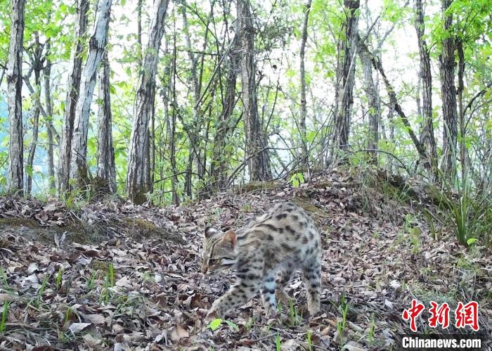 豹猫在湖北堵河源国家级自然保护区自由活动。湖北堵河源国家级自然保护区供图