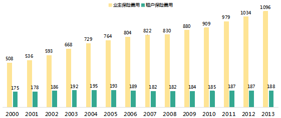 首先,相较于业主保险保费持续快速增长,租户保险保费相对稳定。2000年至2013年,租户保险保费从每年175美元增长至188美元,14年累计增长7.4%,而业主保险费用则实现2倍的增长。