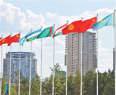 6月15日,在哈萨克斯坦首都阿斯塔纳,中国和中亚五国国旗迎风飘扬。