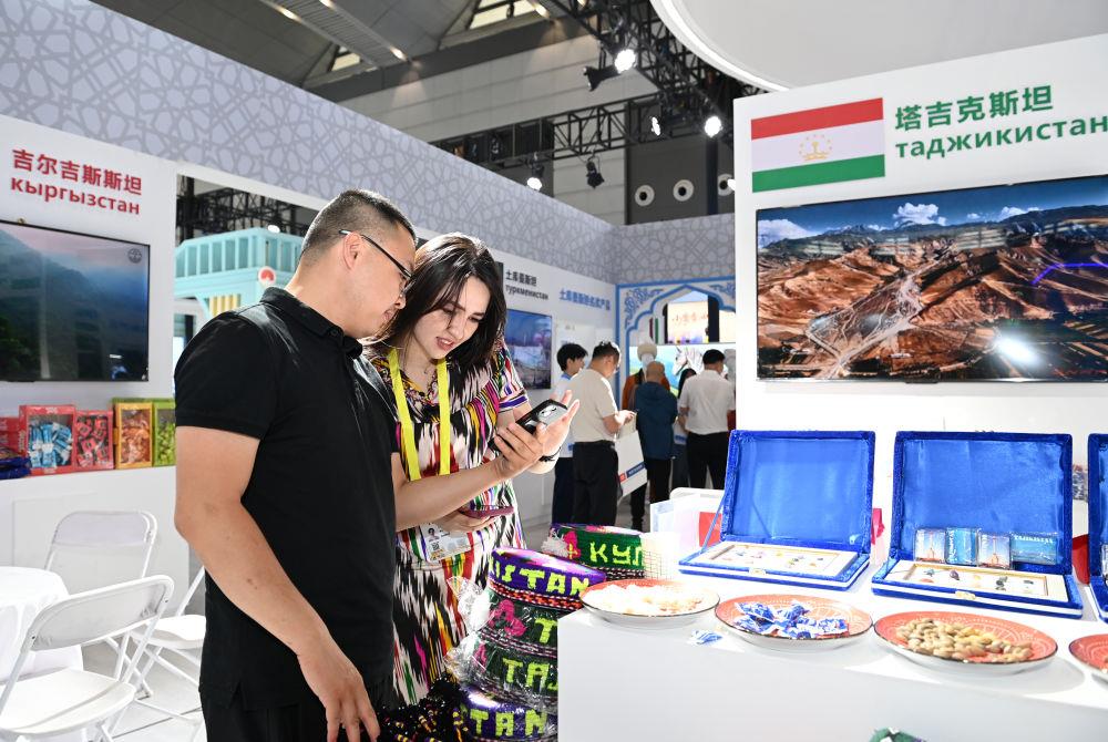 △2025年5月21日,在第九届丝绸之路国际博览会暨中国东西部合作与投资贸易洽谈会丝路优品展上,参观者了解塔吉克斯坦商品。